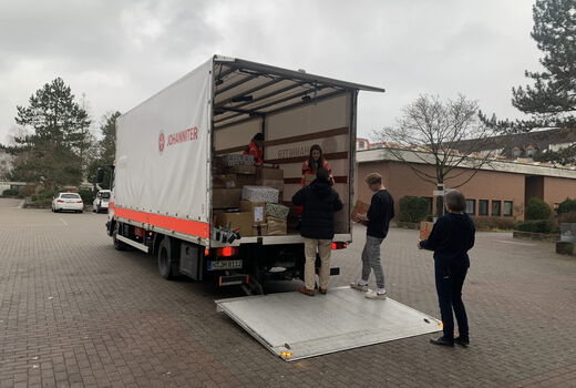 Zusammen werden an der FOSBOS Erlangen in der Vorweihnachtszeit Hilfspakete für notleidende Menschen gepackt.