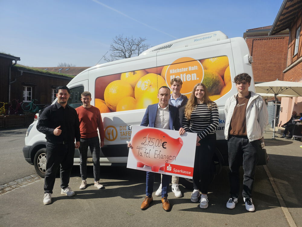 Am 20. März 2024 überreichten eine Schülersprecherin, drei Schülersprecher und unser stellvertretender Schulleiter, Bernd Rüppel, eine Spende unserer SMV in Höhe von 275,00 € an die Tafel Erlangen. Die Gelder stammten aus den Erlösen von dem Verkauf von Schoko-Nikoläusen (Nikolausaktion).