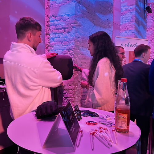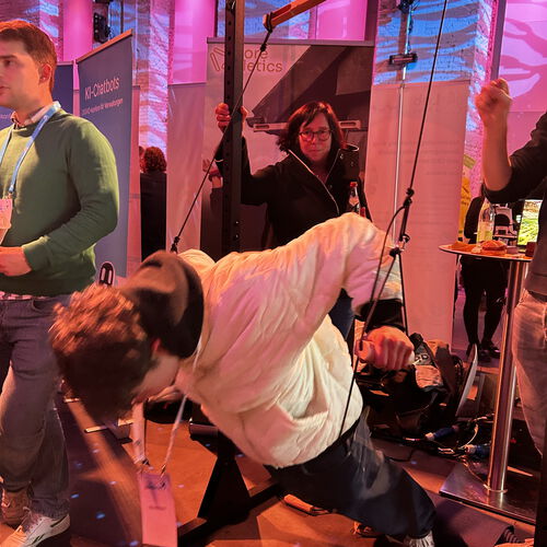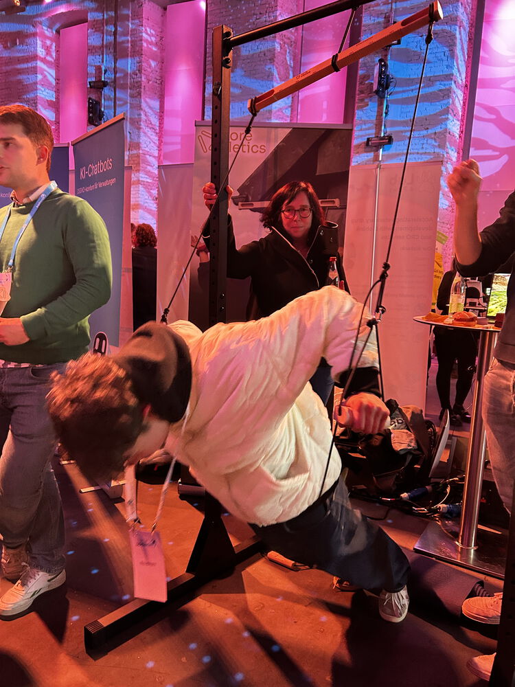 Beim anschließenden Rundgang durch die Startup-Stände gab es viel zu entdecken: Unter anderem eine Drohne, die andere Drohnen abfangen kann, ein Hautimitat, das Tierversuche in der Forschung ersetzen soll, sowie innovative Technik zur Wärmespeicherung über Hausfassaden. Auch zwei Trainingsgeräte – eines für Kletterer und eines zur Reaktionsschulung für Parkinson- und Schlaganfallpatienten – wurden von den Schülerinnen und Schülern direkt ausprobiert.