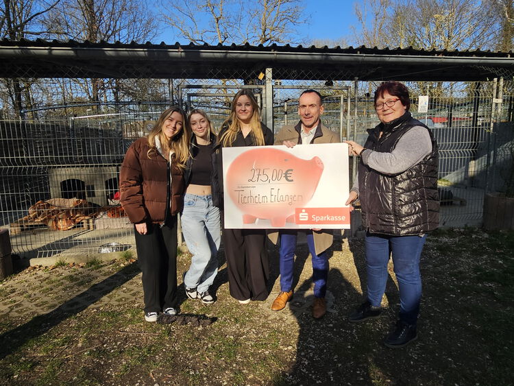 Am 8. März 2024 überreichten drei Schülerinnen und unser stellvertretender Schulleiter, Bernd Rüppel, eine Spende unserer SMV in Höhe von 275,00 € an das Tierheim Erlangen. Die Gelder stammten aus den Erlösen vom Weihnachtsmarkt.