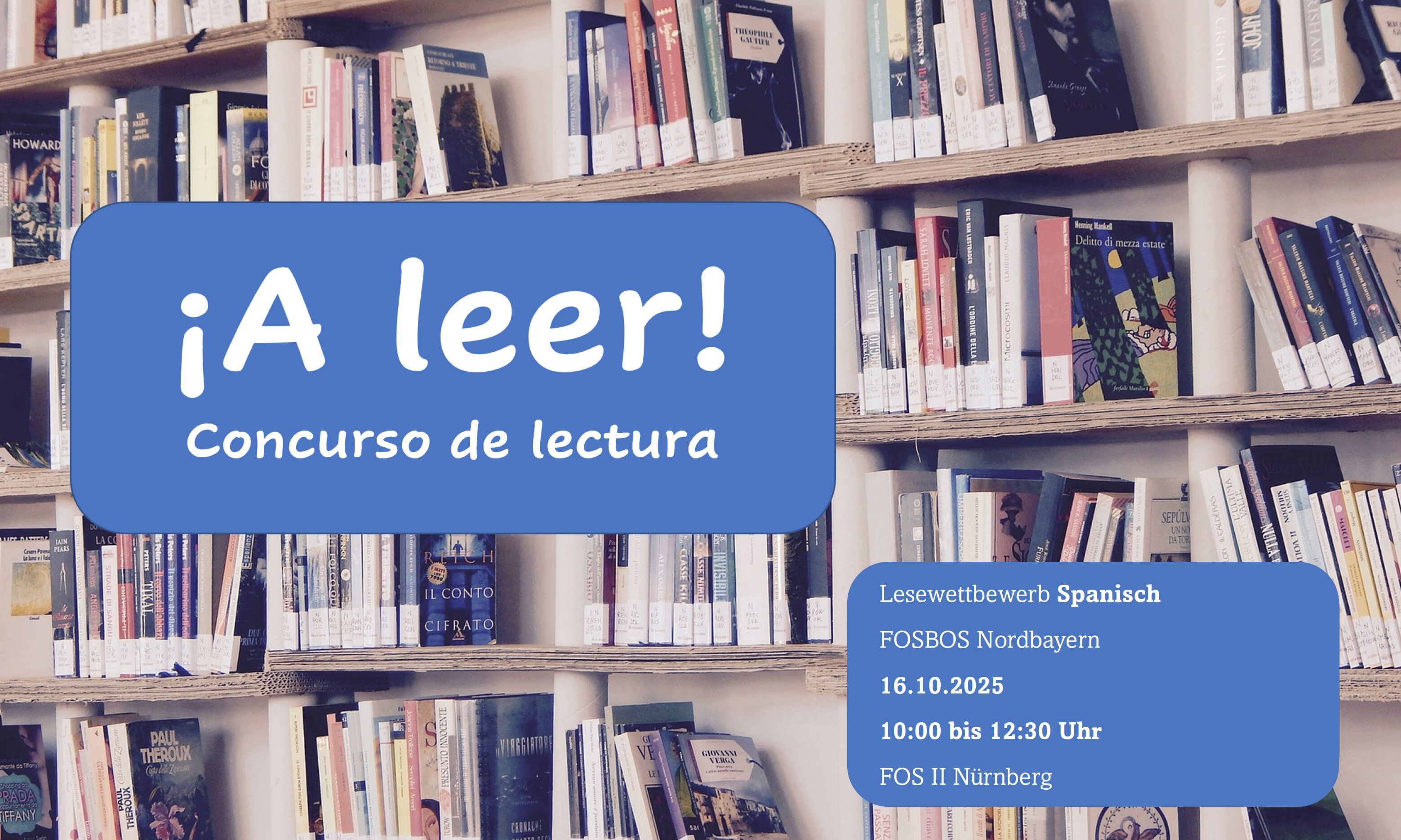 Am diesjährigen Lesewettbewerb Spanisch am 16.10.25 an der FOS II in Nürnberg wird für unsere Schule Leonard aus der T13 teilnehmen. Dabei werden verschiedene Zungenbrecher, ein Gedicht und im Finale ein Auszug aus einem Märchen vorgelesen. Antreten werden Kandidatinnen und Kandidaten von insgesamt elf Fachober- und Berufsoberschulen aus Nordbayern. Die teilweise mit Muttersprachlern besetzte Jury entscheidet über das Weiterkommen und kürt am Ende die Gewinnerin bzw. den Gewinner.