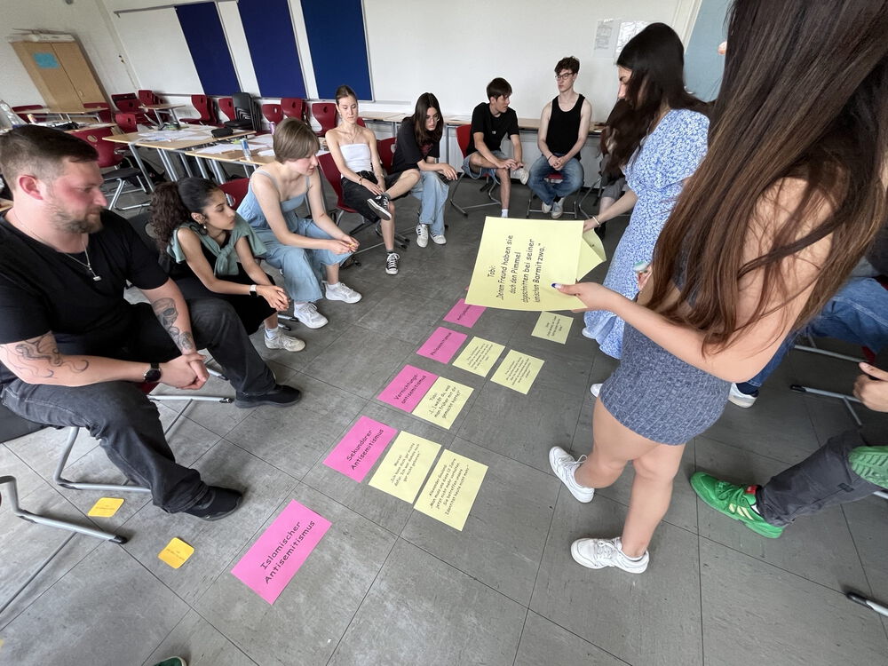Im Laufe des Tages beschäftigten sich die Schülerinnen und Schüler mit sechs Formen von Antisemitismus (Moderner Antisemitismus, Sekundärer Antisemitismus, Antijudaismus, Philosemitismus, Vernichtungsantisemitismus, Islamischer Antisemitismus), die im Alltag von Betroffenen auftreten. Dabei setzten sie sich mit dokumentierten Erfahrungsberichten jüdischer und nichtjüdischer Betroffener auseinander. Zur Vertiefung reflektierten die Schülerinnen und Schüler den Kurzfilm „Masel Tov Cocktail“ und ordneten die Filmaussagen den Formen von Antisemitismus richtig zu.