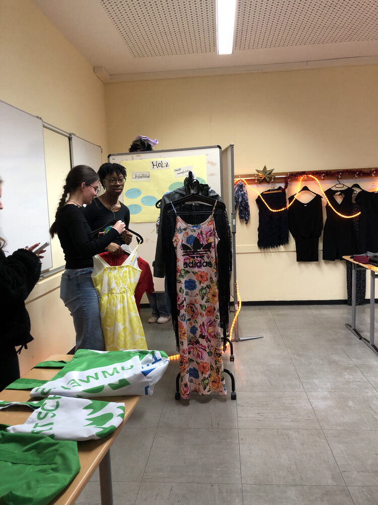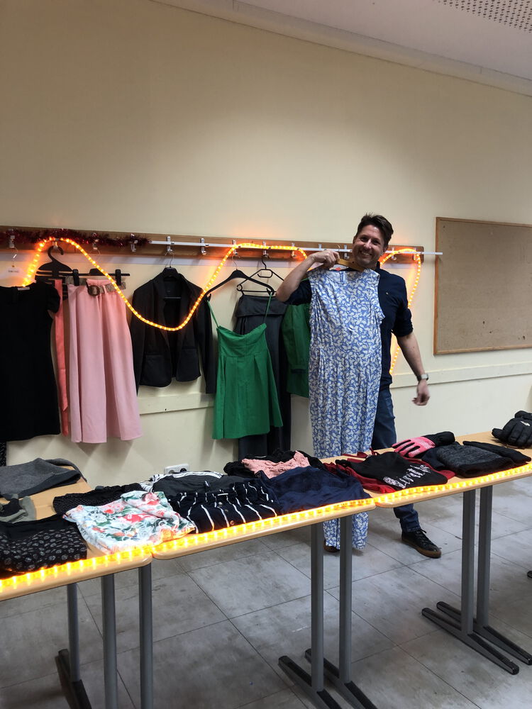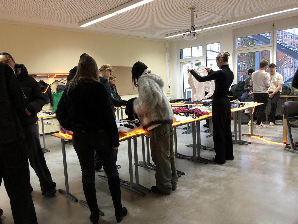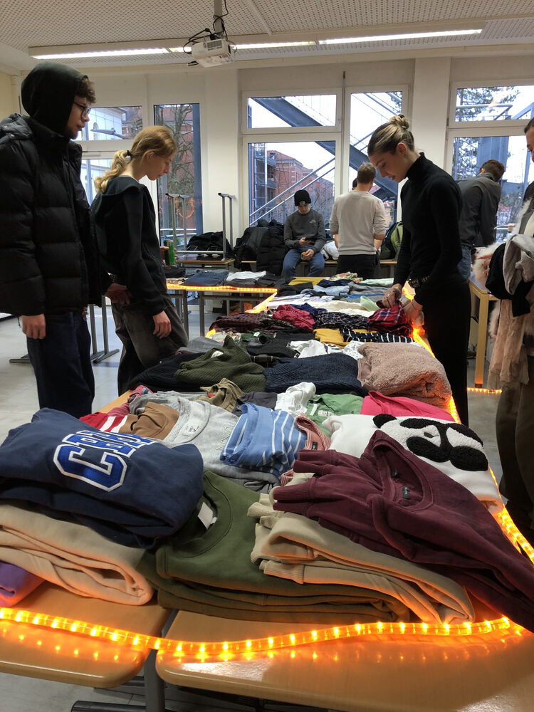 Im Rahmen des Weihnachtsmarkts konnten die Schülerinnen, Schüler und Lehrkräfte unserer Schule nach Herzenslust in den im Vorfeld abgegebenen Kleidungsstücken nach neuen Schätzen stöbern. Second-Hand-Kleidung ist nicht nur modischer Trend, sondern auch aktiver Umweltschutz: die Textilindustrie ist für ca. 10% des weltweiten CO2-Ausstoßes verantwortlich und die ortsnahe Weitergabe noch tragbarer Kleidung somit ein wertvoller Beitrag zum Klimaschutz.